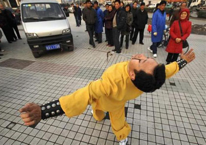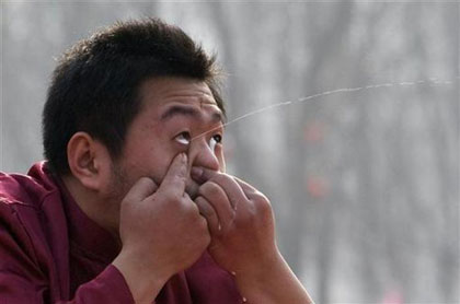 مرد چینی با دمیدن در بینی، شیر از چشم هایش بیرون می دهد.